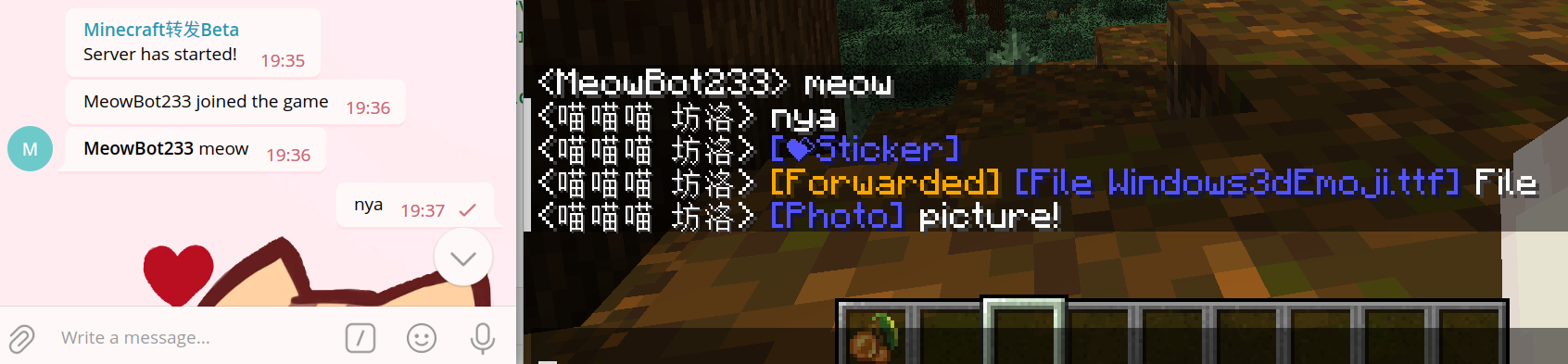 简单的配置即可在TG群组和MC服务器之间互相传递聊天消息等内容。