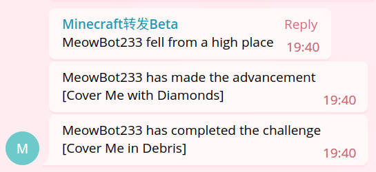 支持传递服务器广播,比如玩家死亡消息等,让你在群里也能嘲笑别人蠢蠢的死法!